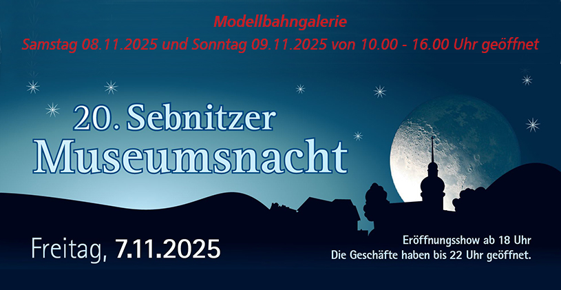 On Friday, November 7th, Sebnitz's Museum and Shopping Night will take place – and of course, our model railway gallery will be open as well. A perfect opportunity to experience the fascination of model railways – both in our museum and in our shop! We look forward to your visit: at our model railway gallery (Lange Straße 58-60 in Sebnitz) on Friday, November 7th, 2025, until 10 pm.